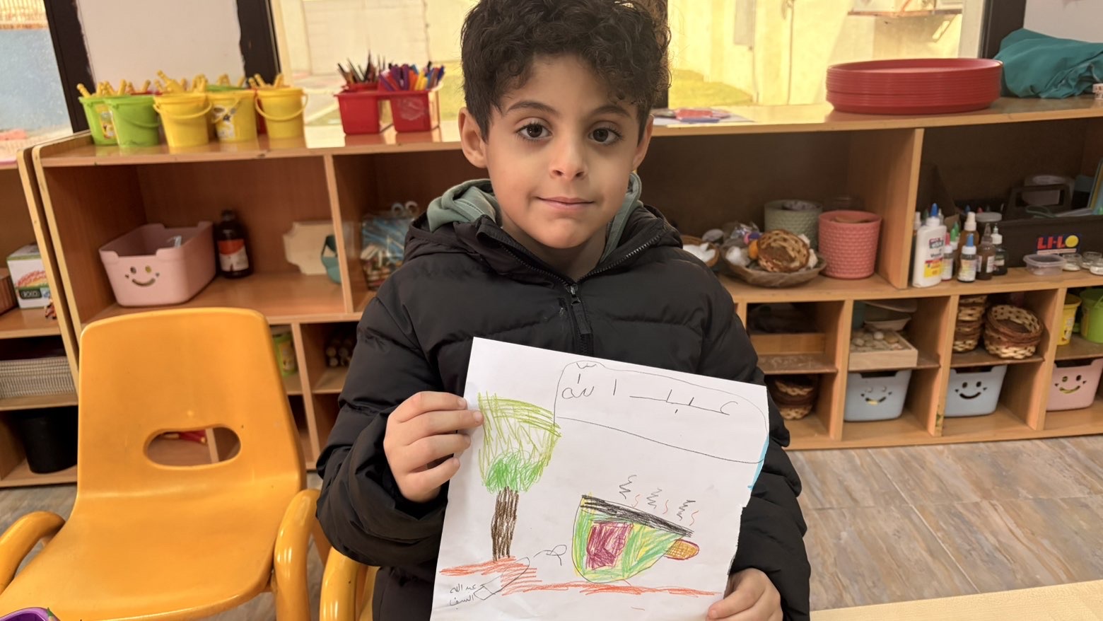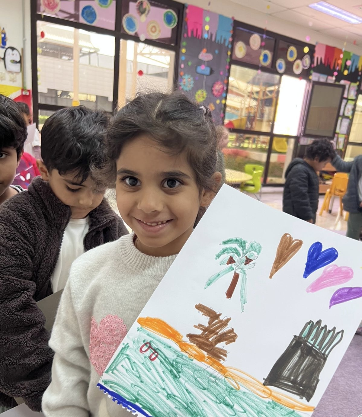 رسم الأطفال عناصر من التراث السعودي كالنخيل والمبخرة والبيوت الطينية والدلة، وعبّروا عن مشاعرهم بألوانهم الزاهية وإبداعاتهم المميزة.